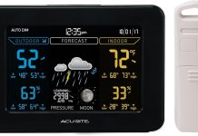 We appreciate that the station tracks indoor and outdoor temperature and humidity values, with daily high/low records for each. Having an auxiliary sensor (TX141TH-BV4 required batteries) gives us flexibility to monitor another location on our property or a different room indoors.