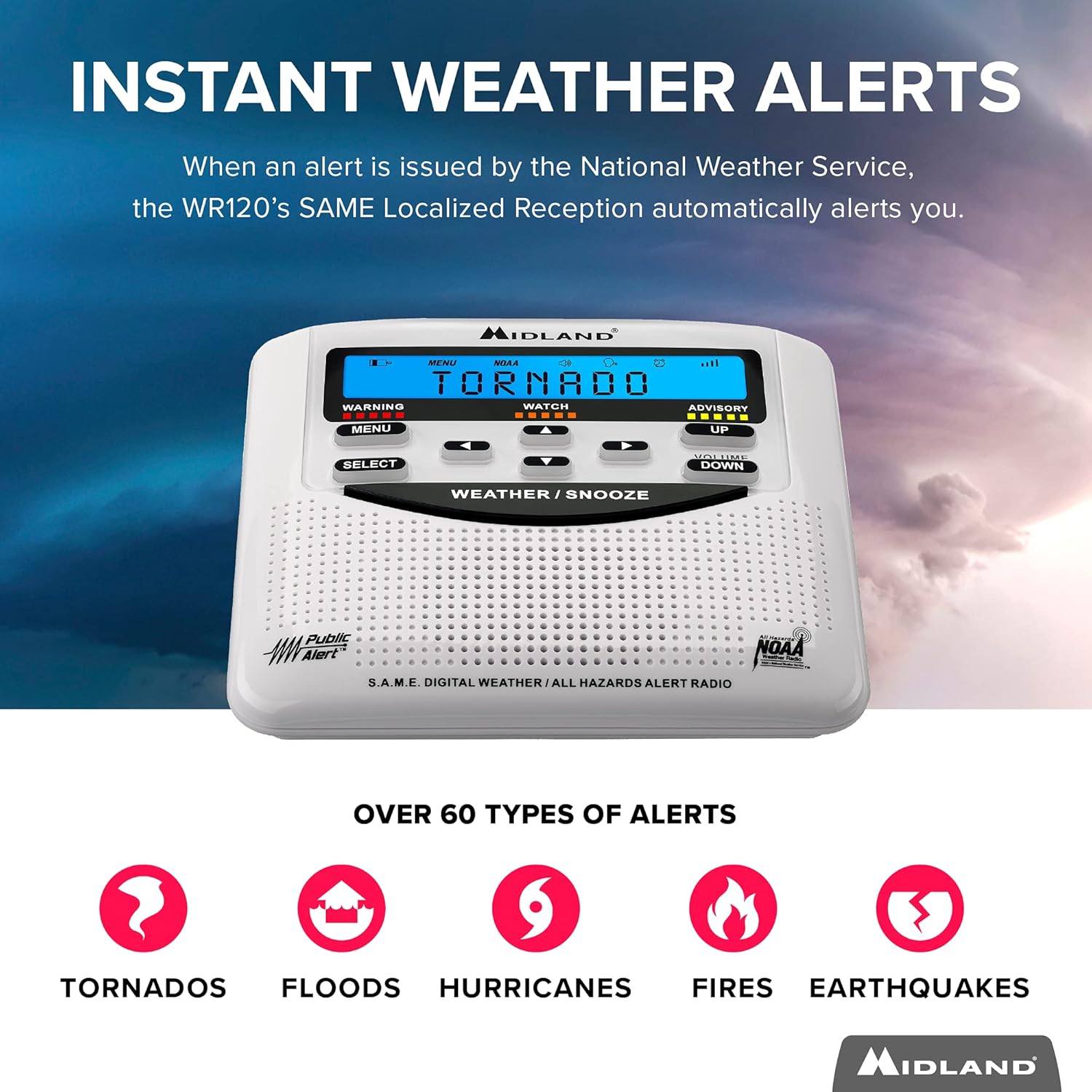 Stay ahead of the storm with the Midland WR120B. This emergency weather alert radio uses NOAA Weather Scan technology to automatically alert you to over 60 types of weather hazards and emergencies. Whether it’s tornadoes, hurricanes, thunderstorms, floods, or wildfires, you’ll be notified in real-time.