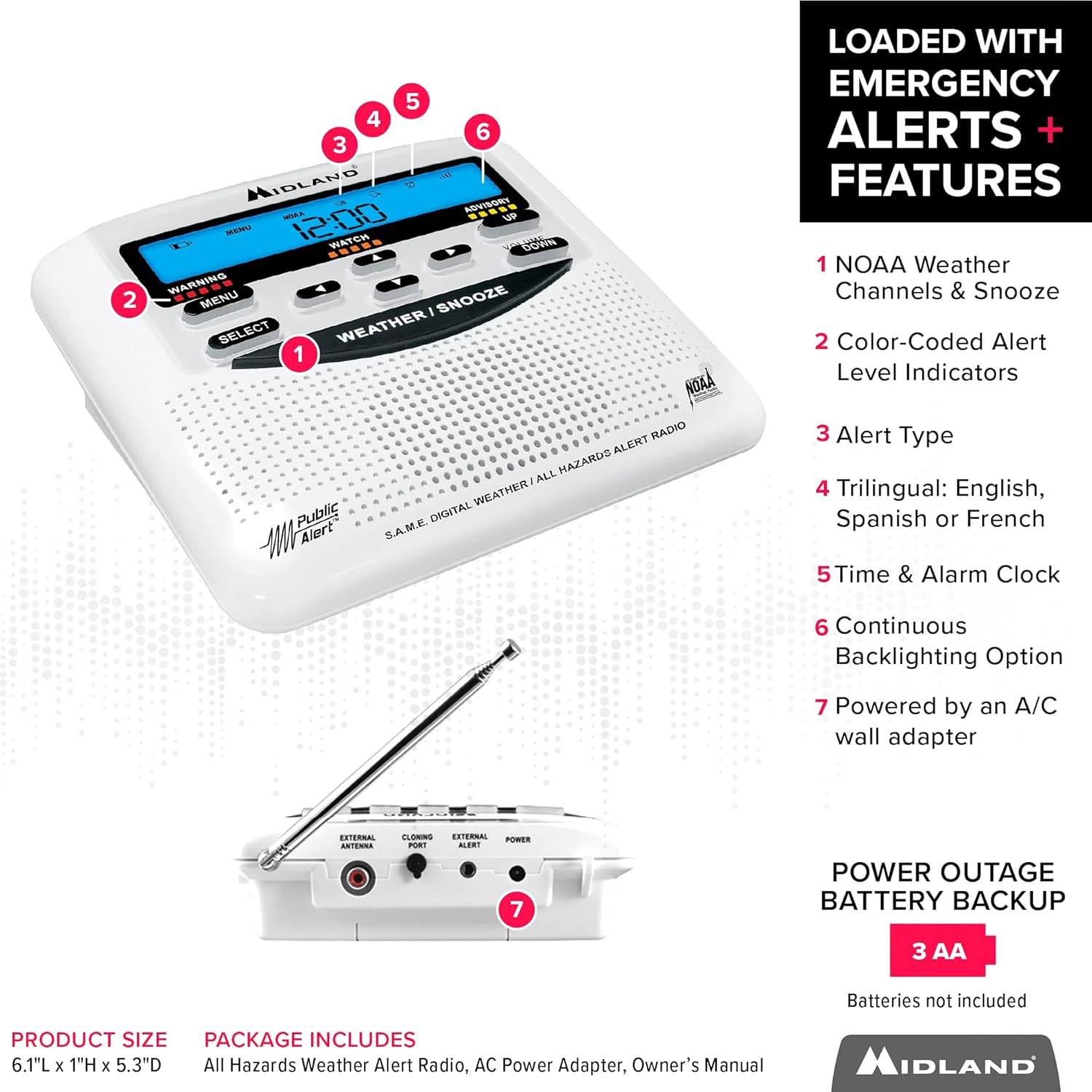 Midland is dedicated to keeping you connected and informed during critical moments. This radio is not just an emergency alert device—it’s also a reliable alarm clock, all built into one compact unit. Stay safe, stay prepared, and trust Midland for all your emergency communication needs.