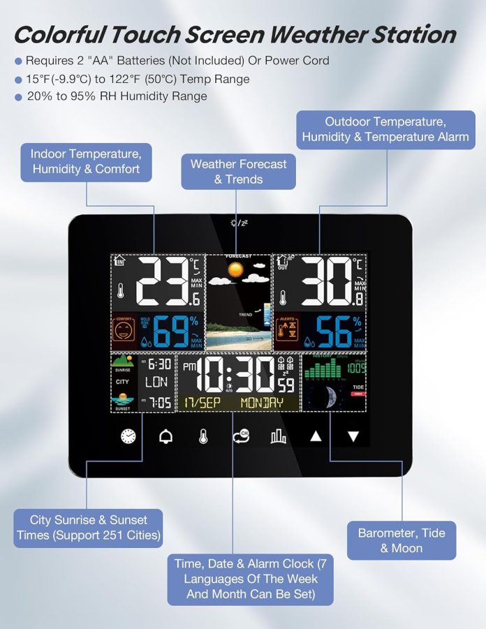 Weather Station Indoor Outdoor Thermometer Wireless, Color Display Temperature Humidity Monitor with Alert, Touch Screen Forecast Station with Sunrise Sunset Barometer Adjustable Backlight(WS03)